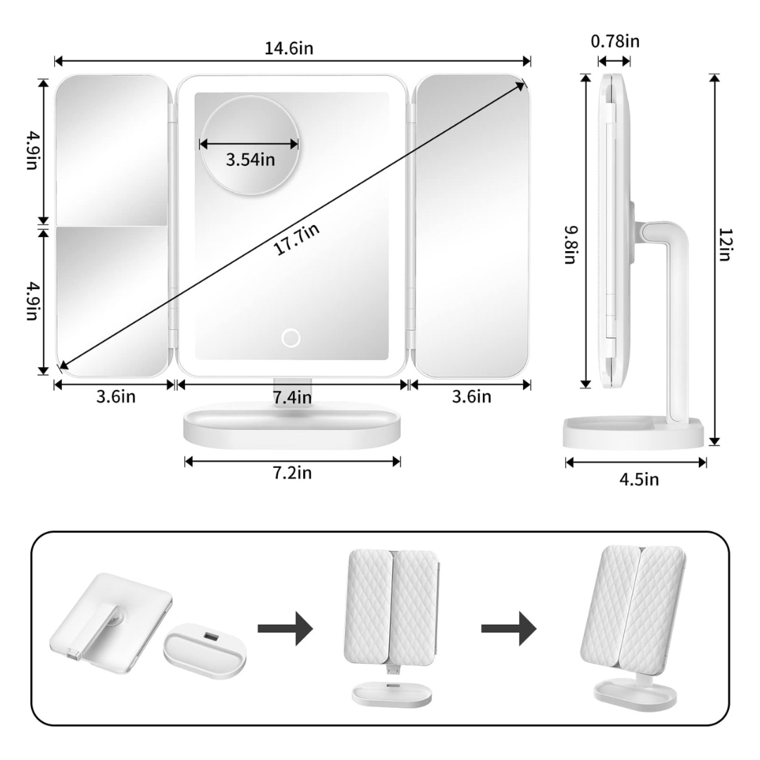 Kies uit 3 verlichtingsstanden om je ideale make-up te creëren. Pas de helderheid aan door de aanraakschakelaar 3 seconden ingedrukt te houden. Vergeet niet de knop aan de achterkant te activeren voor gebruik.